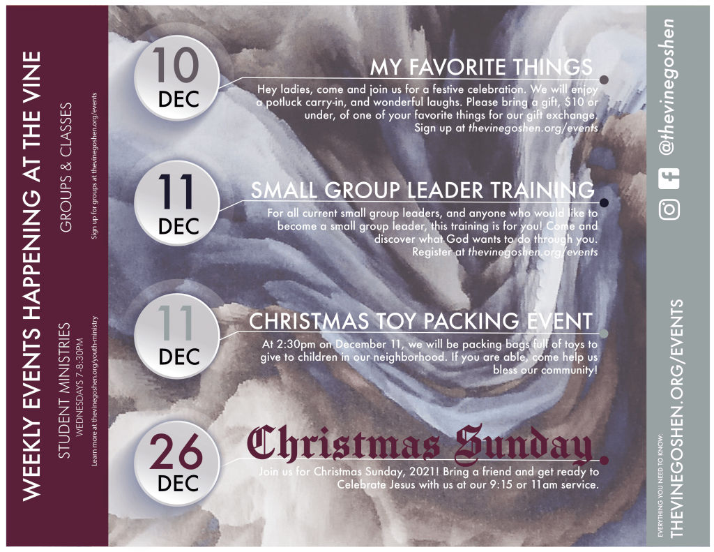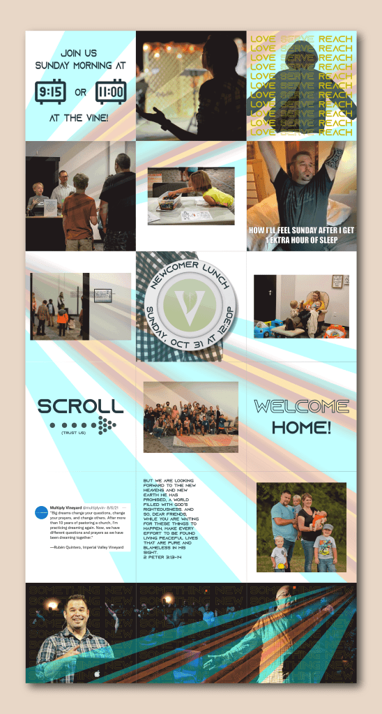 Social Media samples, located at the bottom of the webpage, also represent content I made for their Instagram and Facebook pages. I created graphics and wrote posts to encourage engagement among the community, show potential visitors what the church is like, and have sharable graphics to invite newcomers to the church. The bottom portion of this image shows the start of a new sermon series and continues with content that went along with that series. The photos at the top show the pictures posted before the Christmas service. I chose these photos to give newcomers an idea of the church’s services, building, and community, introduce the kid’s check-in process for newcomers, and help transition followers’ focus to the holiday season.